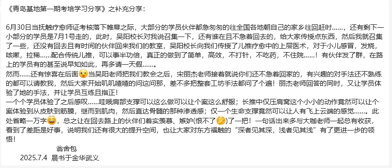 6月28日-30日,首届中医康复抚触疗愈师考核在胶州少海孔子六艺园圆满举行,共计27人报名参加并完成结业考核。
